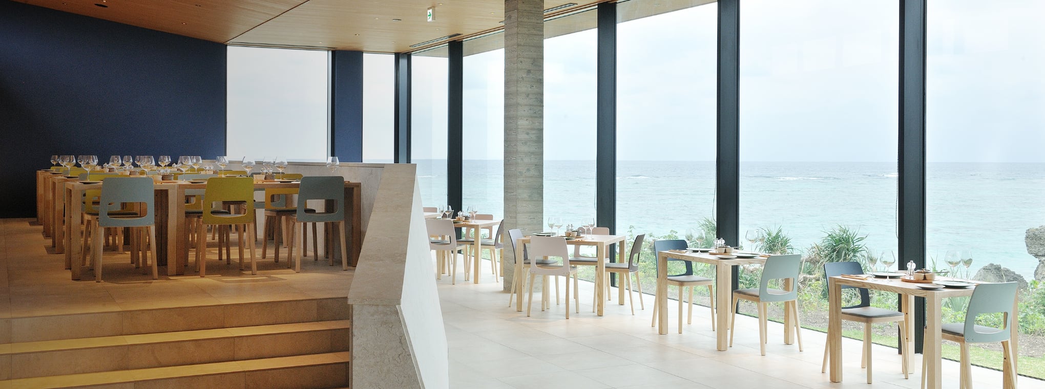 崖の上から浜辺へと続く散策路にある「海辺のテラス」は、海との距離が近く開放感のあるエリアです。海を眺めながらのんびりとおしゃべりを楽しんだり、そのまま浜辺へ出て自然海岸を散策したり、沖縄らしい時間が過ごせます。