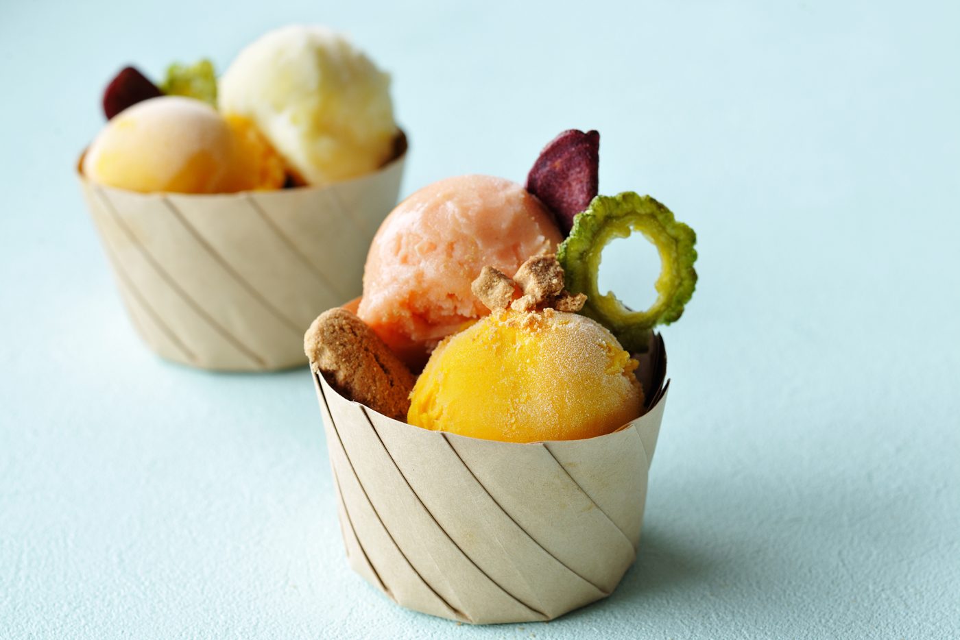 沖縄の言葉、ちゅら(美しい)とジェラートをかけて名付けた、バンタカフェの「ちゅらーと」。マンゴーやシークヮーサー、黒糖などのジェラートに、紅芋やゴーヤのチップスなどのトッピングが楽しめます。