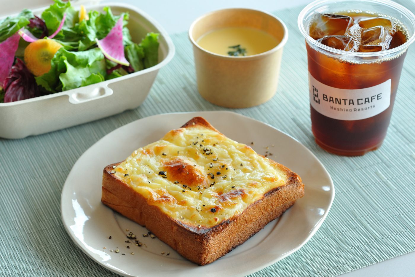 ポークたまごおにぎり、クロックムッシュ、ホットドッグの中から選べるメインと、サラダ・スープ・ドリンクがセットのメニューです。スープは冷製のコーンスープ、ドリンクはアイスコーヒーやさんぴん茶、パイナップルジュースなどから選べます。