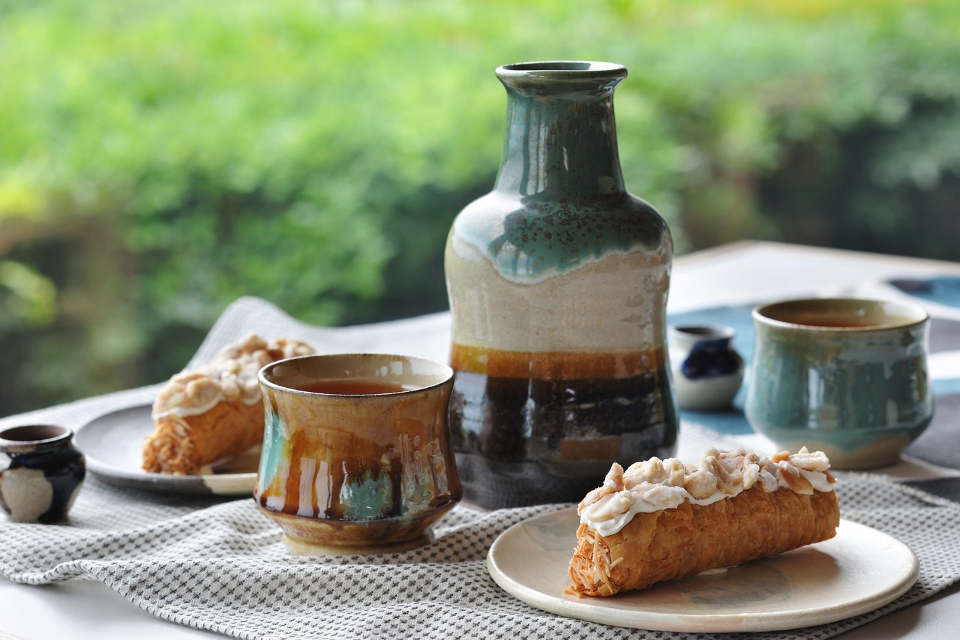 11月1日~24日 「海辺のやちむん市」期間限定メニュー。泡盛を贈る際に使われた伝統の「ゆしびん」をティーポットに見立てて、揃いの湯のみでティータイム。海辺のやちむん市にあわせて作陶いただいた特別なセットです。(さんぴん茶またはハーブティーとのぼり窯コロネ 2個)